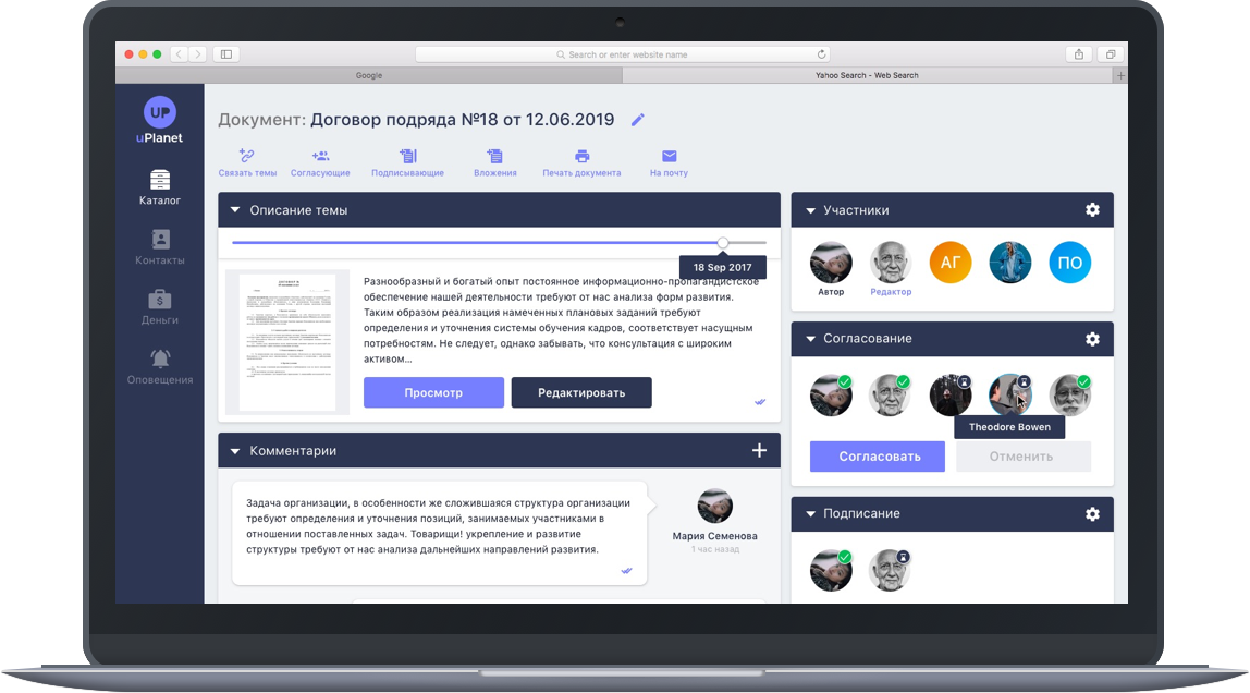 Документы в UPlanet едины для всех, это не два письма в почте каждого, а один документ, к которому участники имеют равный доступ. Такой подход исключает искажения, вы всегда можете быть уверены, что у вашего контрагента такой же набор данных. Для бухгалтерии UPlanet снимает множество лишней работы по переносу данных, а значит информация всегда корректна у обеих сторон.